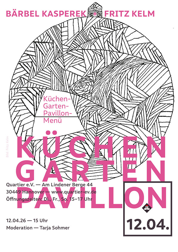 | Es gibt eine weitere Lesung im Küchengartenpavillon Am 12. April um 15 Uhr lesen Bärbel Kasperek und Fritz Kelm Sie servieren im Pavillon ein Menü mit Zutaten aus dem Garten, zubereitet in einer Küche. Eine Collage mit Gedichten und Geschichten von Bärbel Kasperek + Fritz Kelm |