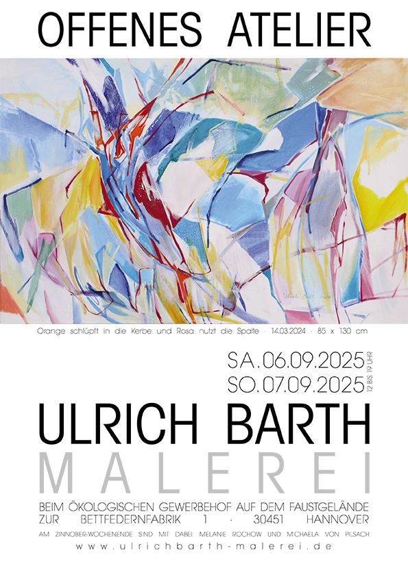 - Rosa rückt an Rot heran - Ulrich Barth - Malerei im Kunstverein Barsinghausen in der Egestorfstraße 28, 30890 Barsinghausen, Kulturzentrum Krawatte vom 14. März bis zum 6. April 2025 Ich danke Stephanie Borrmann (MA) für diese gelungene Eröffnungsrede und dem Kunstverein Barsinghausen für diese schöne und aufmunternde Ausstellung |